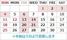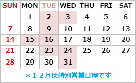 サロンとスタッフのスケジュール ■印を休業とさせていただきます 2025 12月 スタッフの不在スケジュール 根本 … 10日 堤 … 19日 中里 … 21日 2026 1月 スタッフの不在スケジュール 根本 … 26日 ご不便をおかけいたしますが、よろしくお願いいたします。